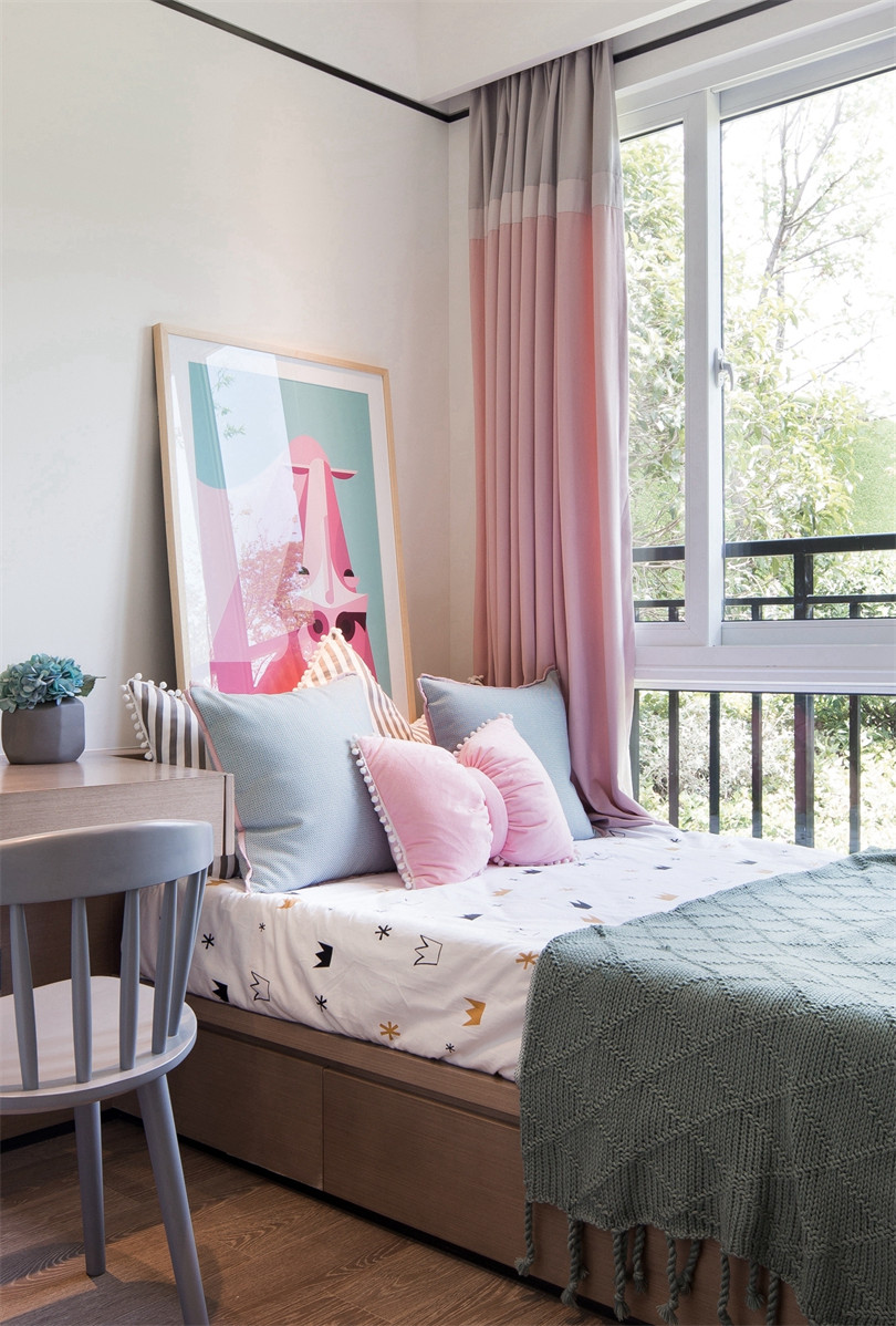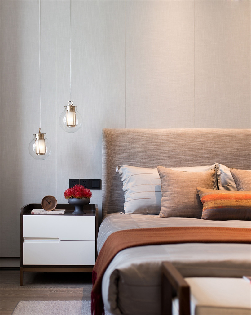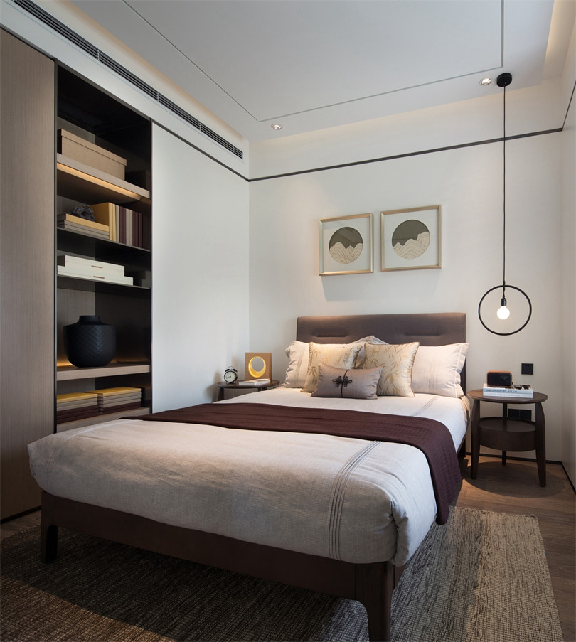 在卧室的打造上更为匠心独具,主卧以“莲”为主题,陶艺装饰在平衡而和谐的布局里别有一派隐居之气,茶具、手串等摆件无一不体现主人的简美生活情趣。老人房则充满空间诗学,衣柜镜面的山水意境画若隐若现,传达出空灵之美,更符合年迈之人的审美习性。儿童房的设计并没有一味附和潮流,而是同其他空间和谐统一,安静的色彩搭配、棋艺装饰,让孩子保持安静的情绪,同样能够品味幽玄之美,远离都市的喧嚣。